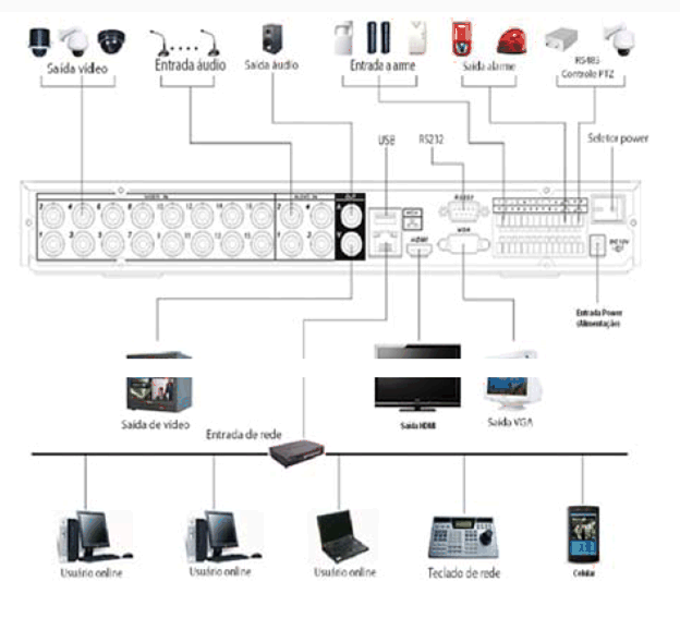 Monitoramento, configuracao total do sistema, controle PTZ, reproducao, download de arquivos gravados,