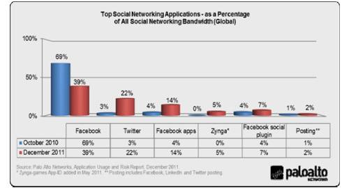 A comparação, segundo o site ZDNet, foi feita ao analisar dados de 1600 empresas, entre outubro de 2010 e dezembro de 2011. A pesquisa também aponta que 80% do tráfego total do Facebook é originário de ambientes de trabalho.